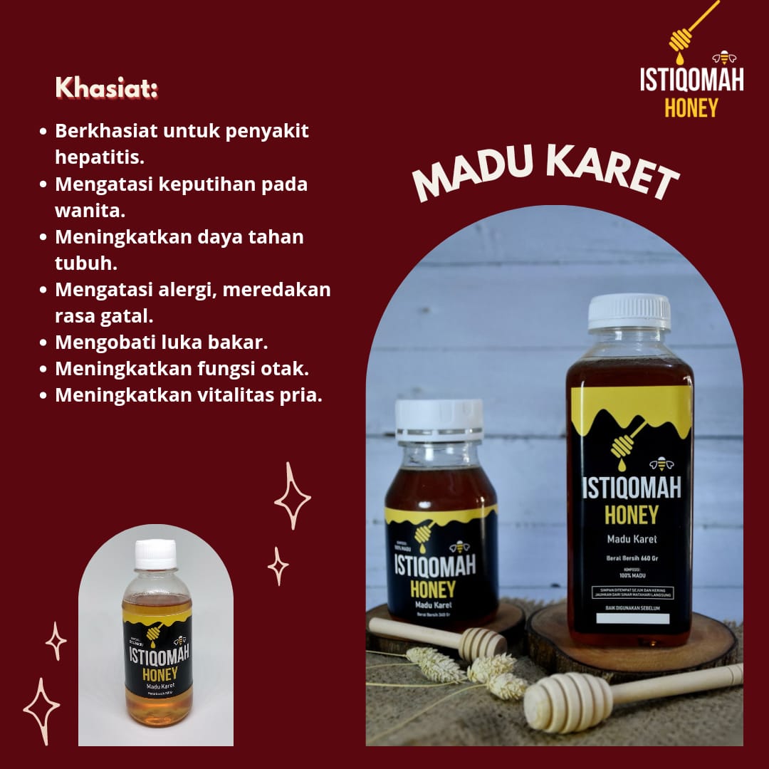 Madu Karet memilki ciri berwarna coklat kekuningan. Rasa madu Karet ini terbilang manis dengan tekstur agak encer ketika ditelan. Selain itu madu jenis ini beraroma karet yang khas.